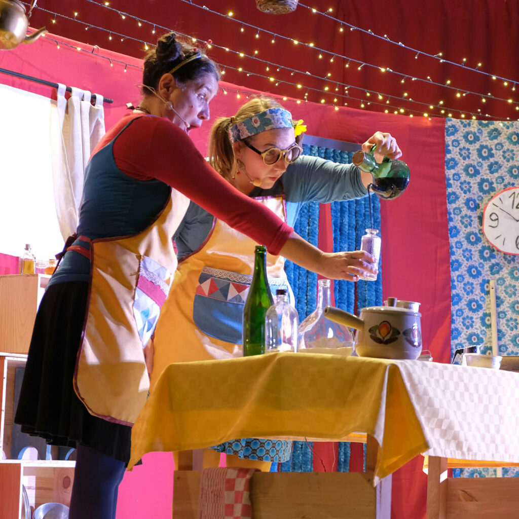Tartine et Mirabelle embarquent le public dans une cuisine haute en couleur. Un tourbillon de sensations et de saveurs donnera vie à l’esprit de Noël, de la convivialité et bien sûr de la gourmandise Miam ! Deux cuisinières plus que farfelues qui patouillent, renversent, tambouillent dans leur cuisine faite de bric et de broc pour réaliser la recette du Croqu’Noël. Le seul, l’unique Croqu’Noël doit être parfait car il possède des vertus magiques qui transforment l’ordinaire en extraordinaire.