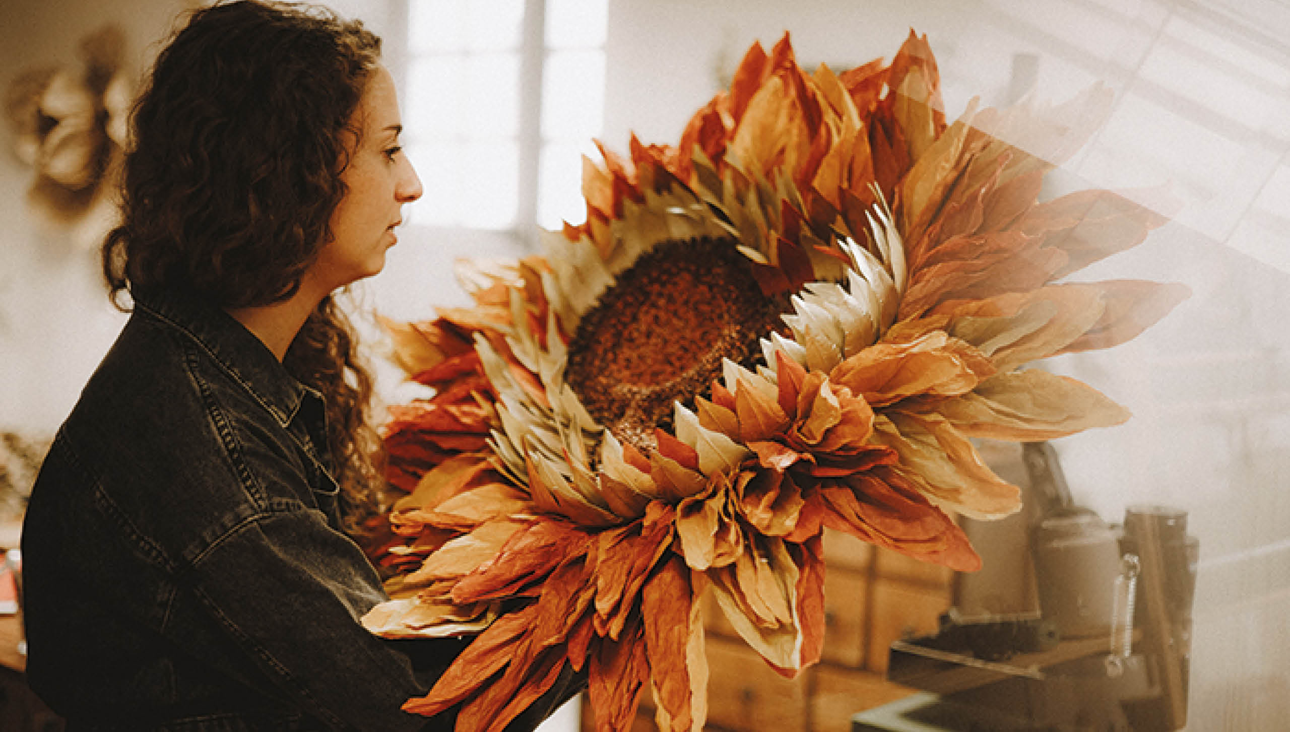 Janique Bourget, artiste formée aux métiers d’art et au design, développe une recherche sur la métamorphose de la feuille. Qu’elle soit de papier, d’or ou de laiton, sa pratique oscille entre sculpture et paysage, interrogeant le vide, la lumière et le corps en mouvement. Elle crée des portes, des seuils, des souffles figés.